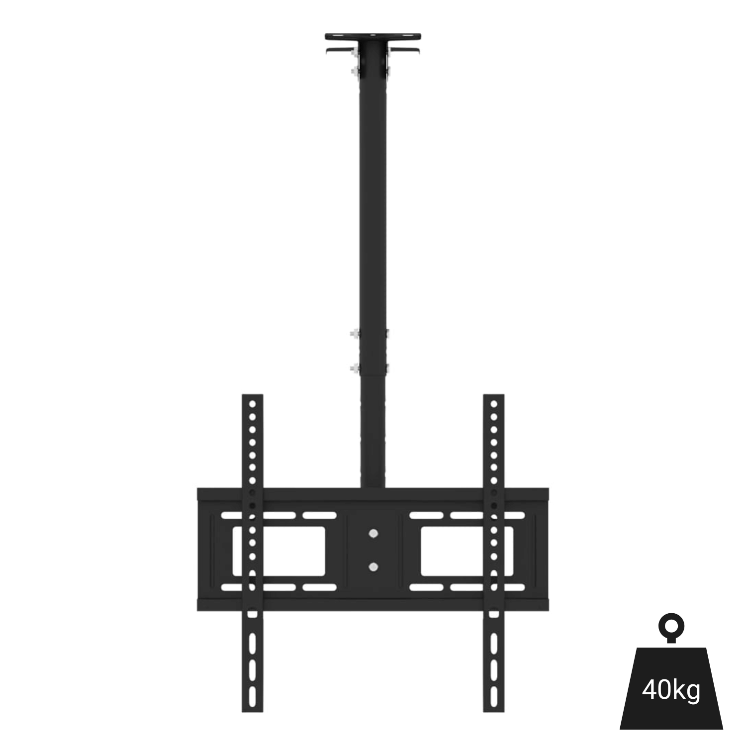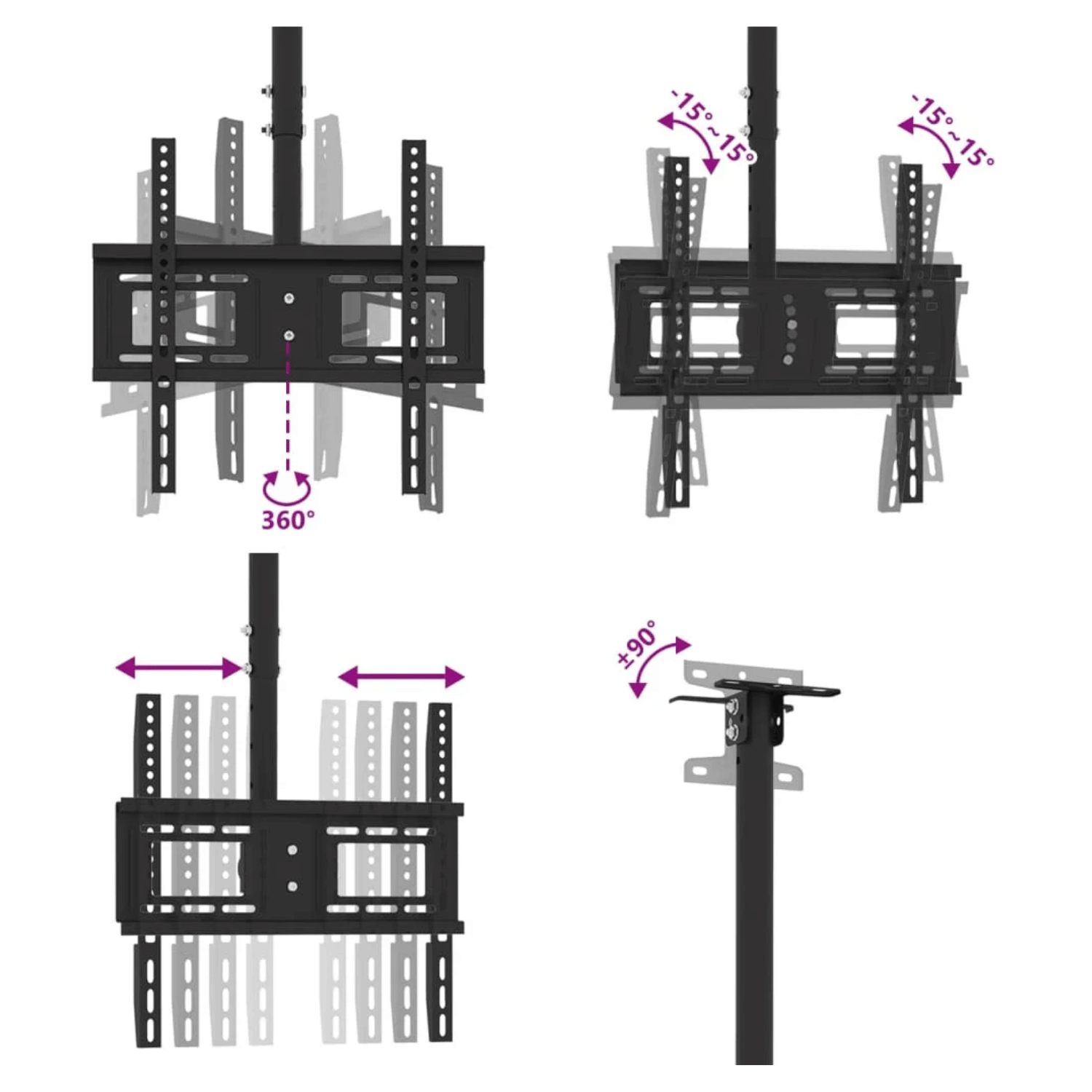 Support TV au plafond pour écrans de 32 à 65 pouces, capacité 40 kg. Hauteur ajustable, rotation à 360°, inclinaison ±15° et compatibilité VESA jusqu’à 400x400 mm. Convient pour optimiser l’espace en conservant une bonne stabilité.