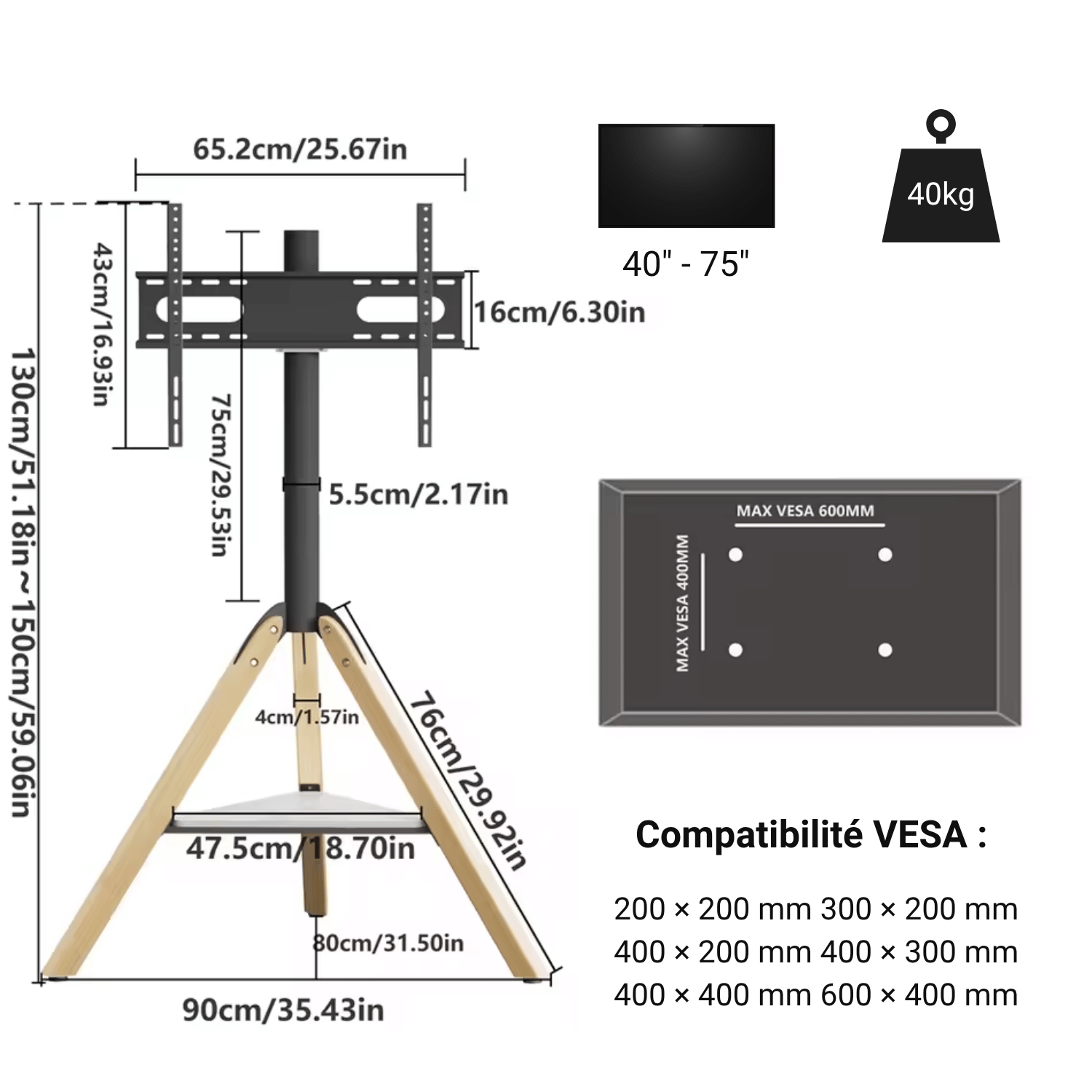 Compatibilité écran : 40" à 75" (≈ 102 à 190 cm)